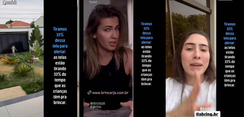 No Mês das Crianças, a ABRINQ (Associação Brasileira dos Fabricantes de Brinquedos) lança uma campanha criada pela DPZ para alertar sobre o tempo excessivo que os pequenos passam em frente às telas. Em uma ação impactante no Instagram, 33% do espaço dos stories de creators foi ocultado — a mesma proporção do tempo livre que as crianças gastam com eletrônicos — chamando atenção para a necessidade de equilibrar o uso de dispositivos e o tempo de brincar.