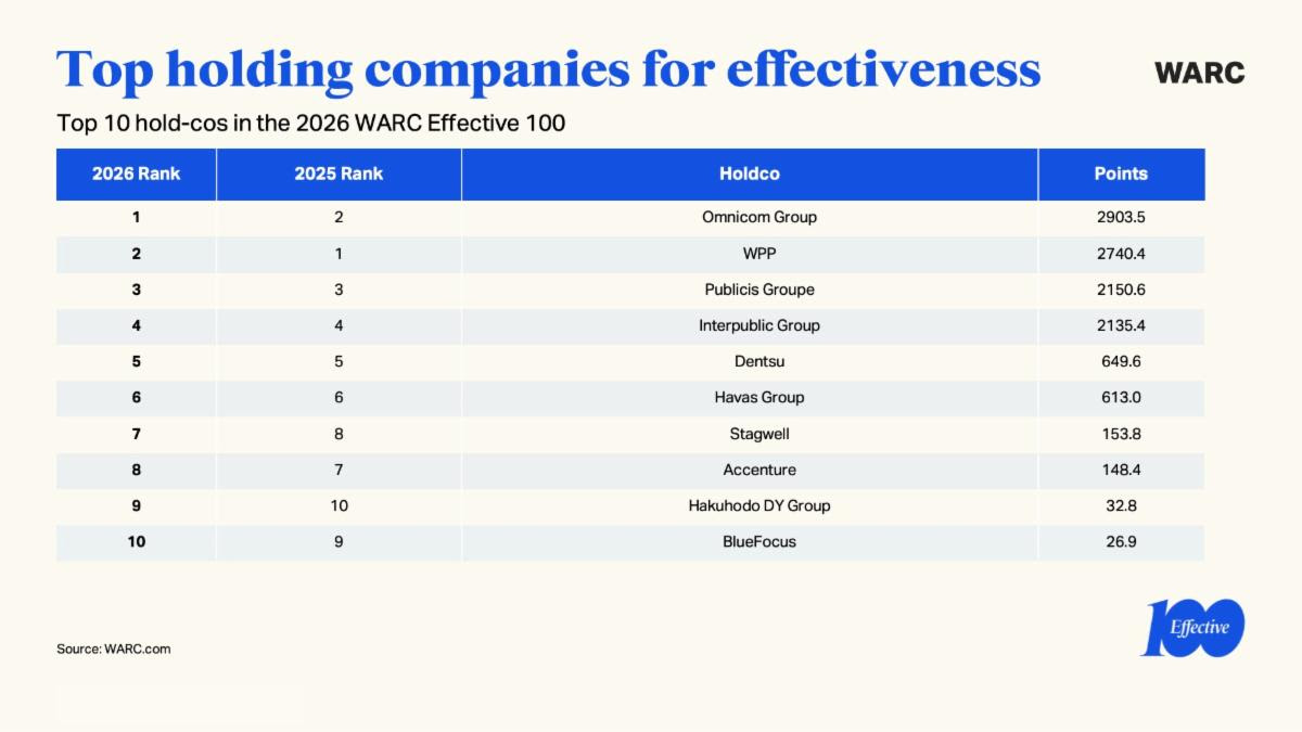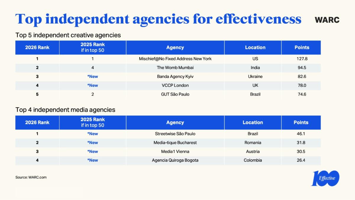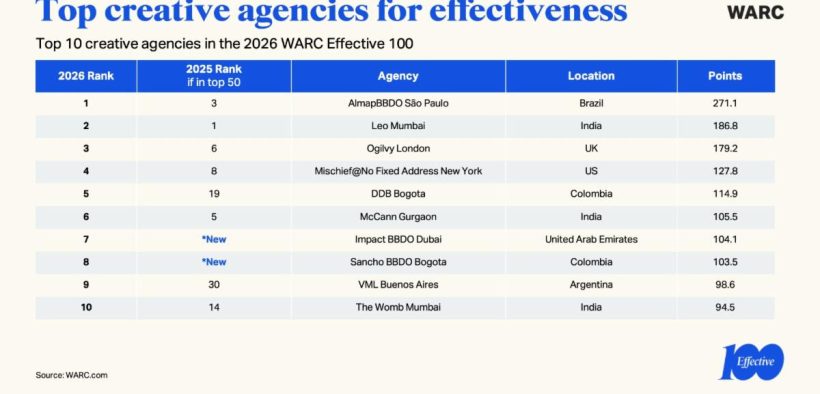 O Brasil ocupa posição de destaque no WARC Effective 100 2026, principal benchmark global de efetividade em marketing, com duas lideranças estratégicas: a AlmapBBDO como agência criativa mais eficaz do mundo e a Streetwise, de São Paulo, no topo entre as agências independentes de mídia.