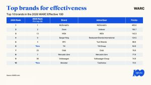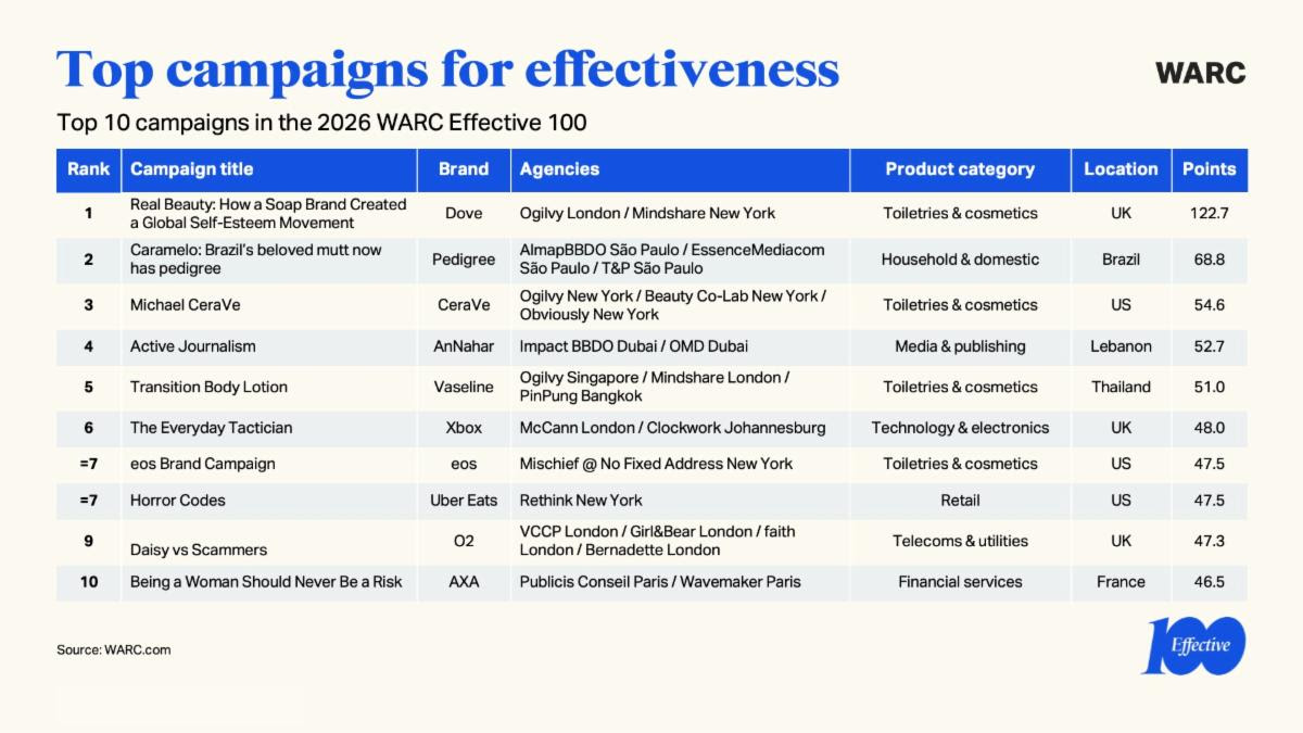 No ranking geral, a campanha mais eficaz do ano foi “Real Beauty”, da Dove, assinada por Ogilvy London e Mindshare New York, reforçando a relevância de plataformas de marca consistentes e de longo prazo.