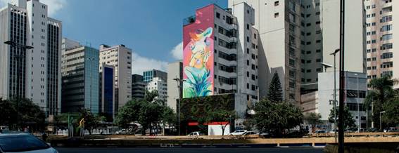 Uma empena cega de um prédio com 20 metros de altura, na esquina da avenida Paulista e da rua da Consolação, ganhou vida e cores por meio da ação “Tudo de cor para você”, da Tintas Coral. No local, o projeto assinado pela Bullet, promoveu uma intervenção artística unindo grafite com jardim vertical. Para realizar a arte na empena, o “Tudo de cor para você” convidou o artista NOVE, cuja obra representa o diálogo entre arte, natureza e a cidade.