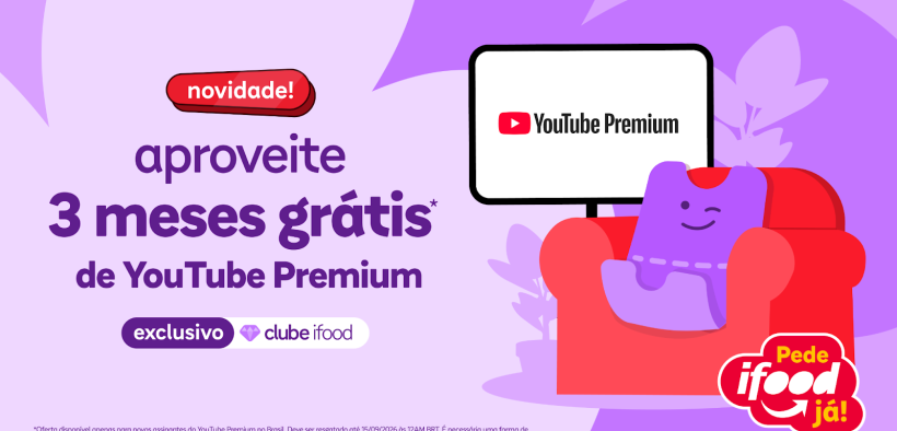 O iFood, em parceria com o YouTube, passa a oferecer três meses gratuitos de YouTube Premium para membros do Clube iFood que nunca assinaram o serviço. O benefício inclui vídeos sem anúncios, reprodução em segundo plano e downloads offline.