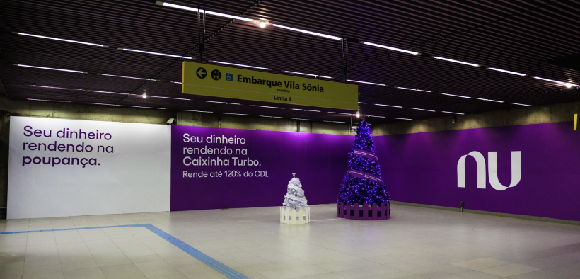 Para ilustrar esse comparativo de forma simples e visual, o Nubank transforma espaços públicos em peças de conteúdo: escadas, vagões, pontos de transporte coletivo e até árvores de Natal recebem intervenções que representam, de maneira figurada, a diferença de rendimento entre a poupança e a Caixinha Turbo.