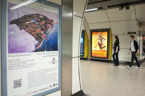 Durante o mês do jubileu da Rainha Mãe, o Rio Grande do Sul está bem representado em Londres. Um mapa do Estado, que foi criado especialmente para Secretaria de Turismo do RS, é agora parte integrante da exposição de arte contemporânea Art Below. A peça é resultado da parceria entre a Agência Escala e o Estúdio Romeu & Julieta, e é uma das obras de arte que estão expostas nas estações de metrô de Londres neste mês de junho. O mapa já esteve em exposição na estação London Bridge e, entre os dias 19/06 a 30/06, ficará exposto também no Hospital Club na tradicional parada de Covent Garden. Dia 26/06 haverá um coquetel com apenas 16 artistas, dos mais de 60 participantes da Art Below, os quais foram selecionados para troca de ideias e informações sobre a obra exposta.